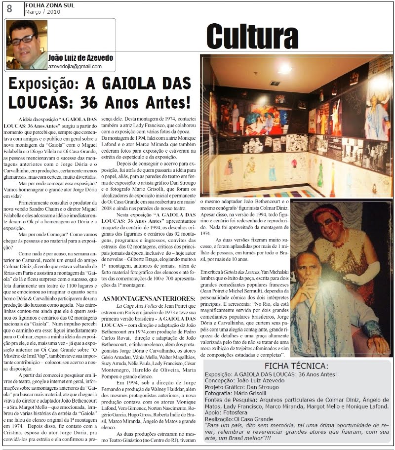 Hoje, dia 04/março 2010, é um dia Especial: além da estréia de "A GAIOLA DAS LOUCAS" com Miguel Falabella, Diogo Vilela e grande elenco com a produção luxuossíssima de Sandro Chaim, é também o dia da inauguração da exposição "A GAIOLA DAS LOUCAS: 36 Anos Antes!" no foyer do Oi Casa Grande.